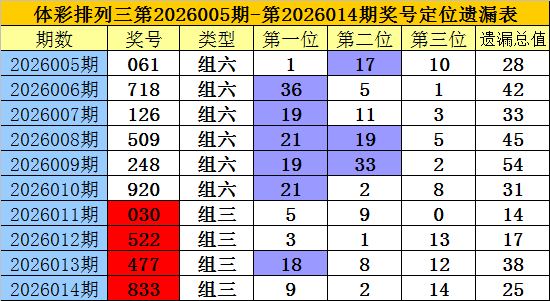 开奖回归:摆设三第2026014期奖号为:833,诸位号码遗漏值分手为9、2、14,遗漏总值为25。
